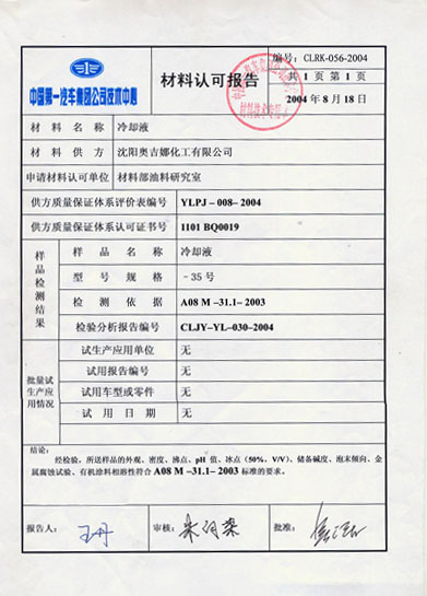沈陽奧吉娜化工有限公司繼防凍液獲得一汽集團(tuán)技術(shù)中心認(rèn)證后,DOT3制動液于09年5月13日再次獲得一汽集團(tuán)技術(shù)中心認(rèn)證,為奧吉娜化工有限公司制動液在一汽集團(tuán)所屬的汽車制造廠和售服系統(tǒng)推廣提供了及其有力的條件。使得雙方在配套領(lǐng)域的合作關(guān)系得到了進(jìn)一步的加強(qiáng)。同時(shí)提升了奧吉娜化工在全國范圍內(nèi)汽車油品配套領(lǐng)域的知名度和影響力。