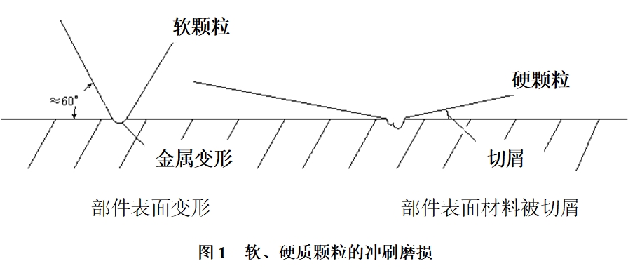“沖蝕”磨損是指污染顆粒隨著高速流動的油液,不斷向油液系統中部件的表面吹射沖刷,使被沖刷部位受到磨損。污染顆粒有軟硬之分,軟質顆粒的沖蝕磨損使被沖擊部件表面變形,在表層下產生缺陷后損壞。硬質顆粒的沖蝕磨損使被沖刷部件表面材料晶格錯位、滑移,加劇部件疲勞或使材料表面直接被切屑剝離而形成嚴重磨損。如圖1所示。